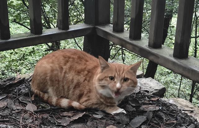 今天爬山遇见了一只大黄猫,它悠闲地躺在石头上,似乎在思考着什么。