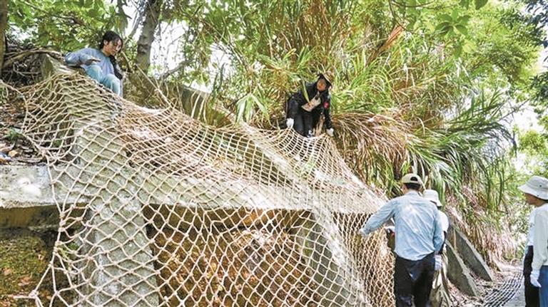 “我们希望通过简易的‘桥’,让这些小生命重新自由穿行。”项目工作人员介绍,基于小型爬行动物和哺乳动物的生物学特性,项目团队选择在现场搭建绳网与铁网两种结构的“桥”。一类是绳网组:在一侧陡坡搭建由粗绳编织而成的网格。绳网富有弹性,表面摩擦力较大,方便小动物们爬行。一类是铁网组:在另一侧陡坡铺设铁丝网,并用绳索固定在周边树木上。